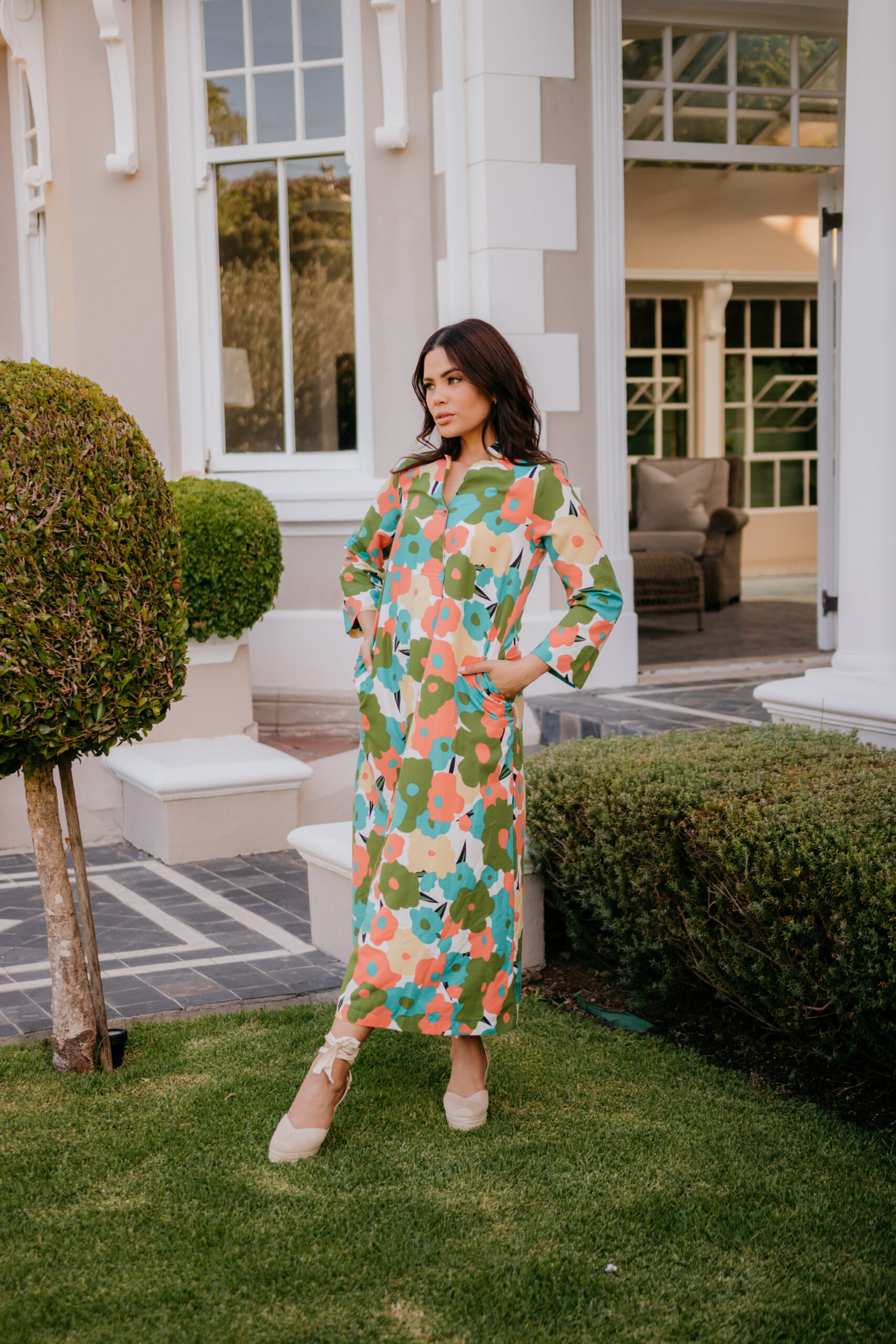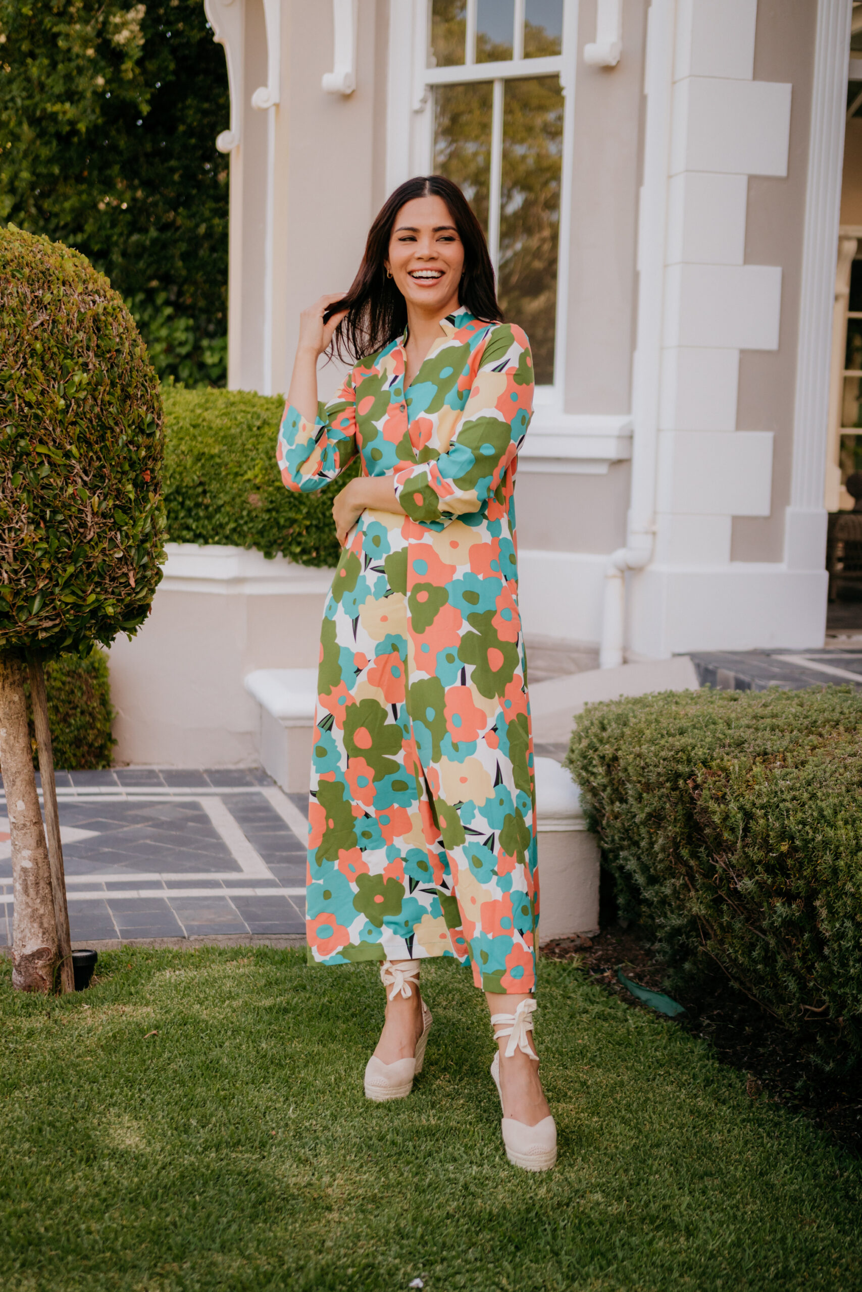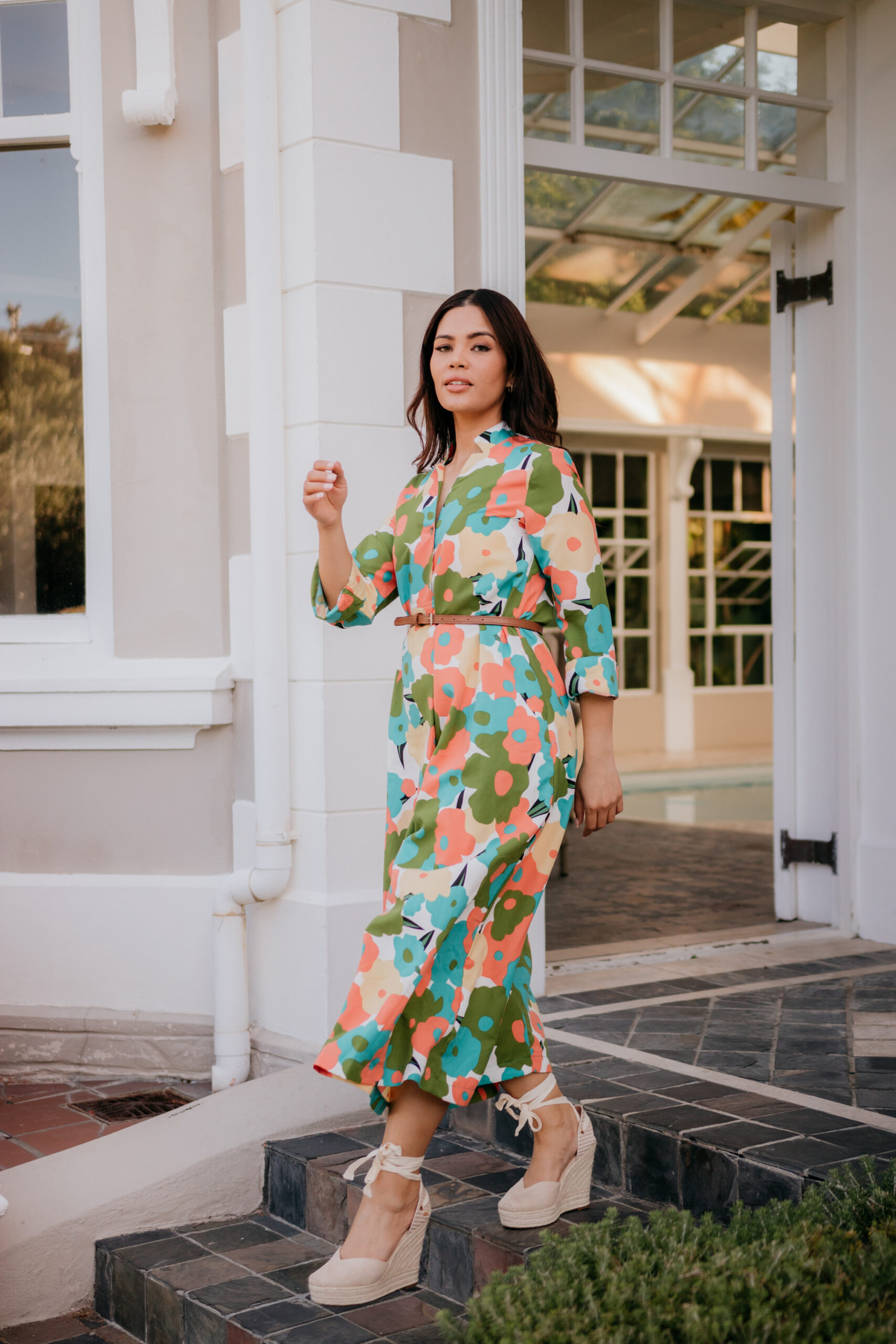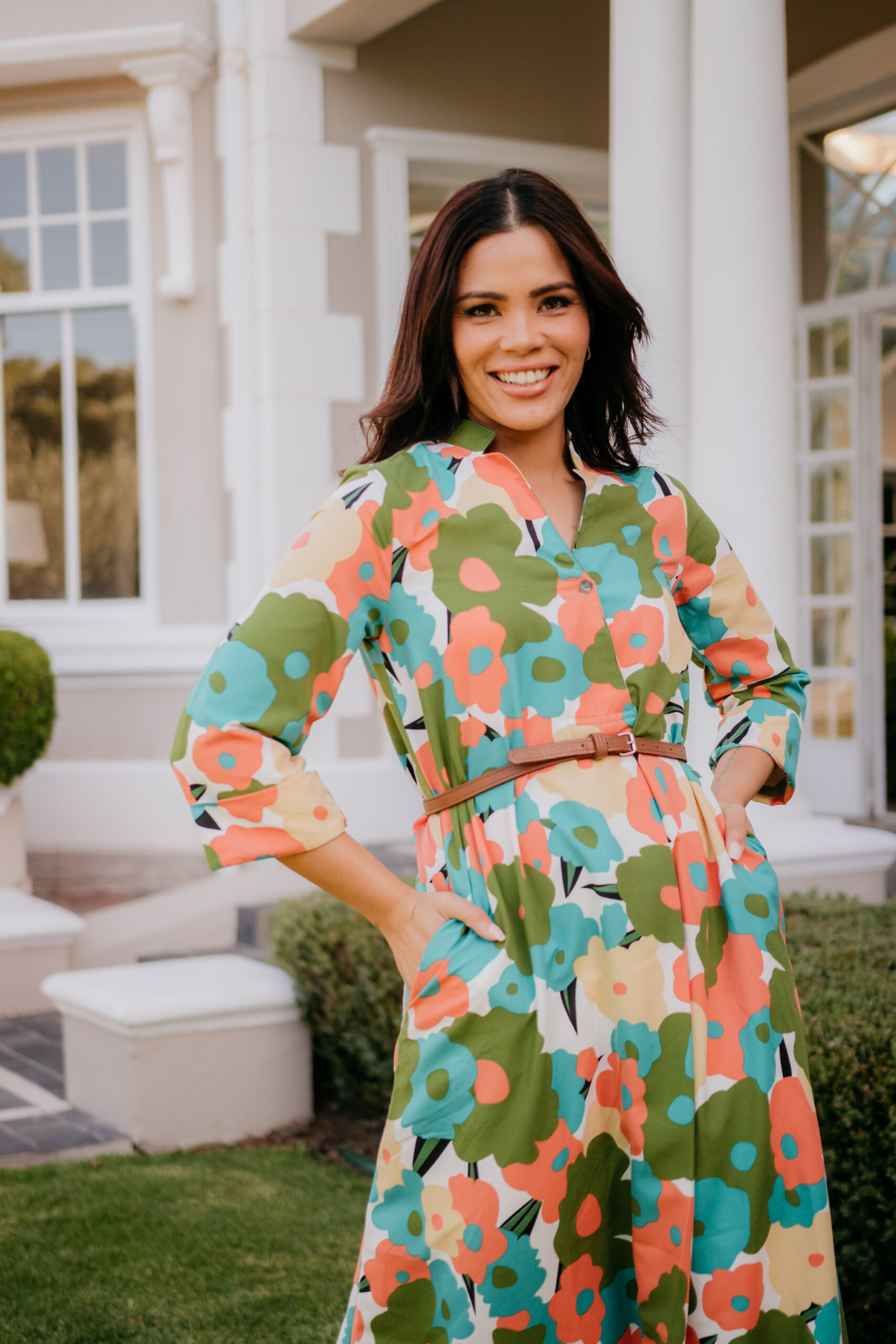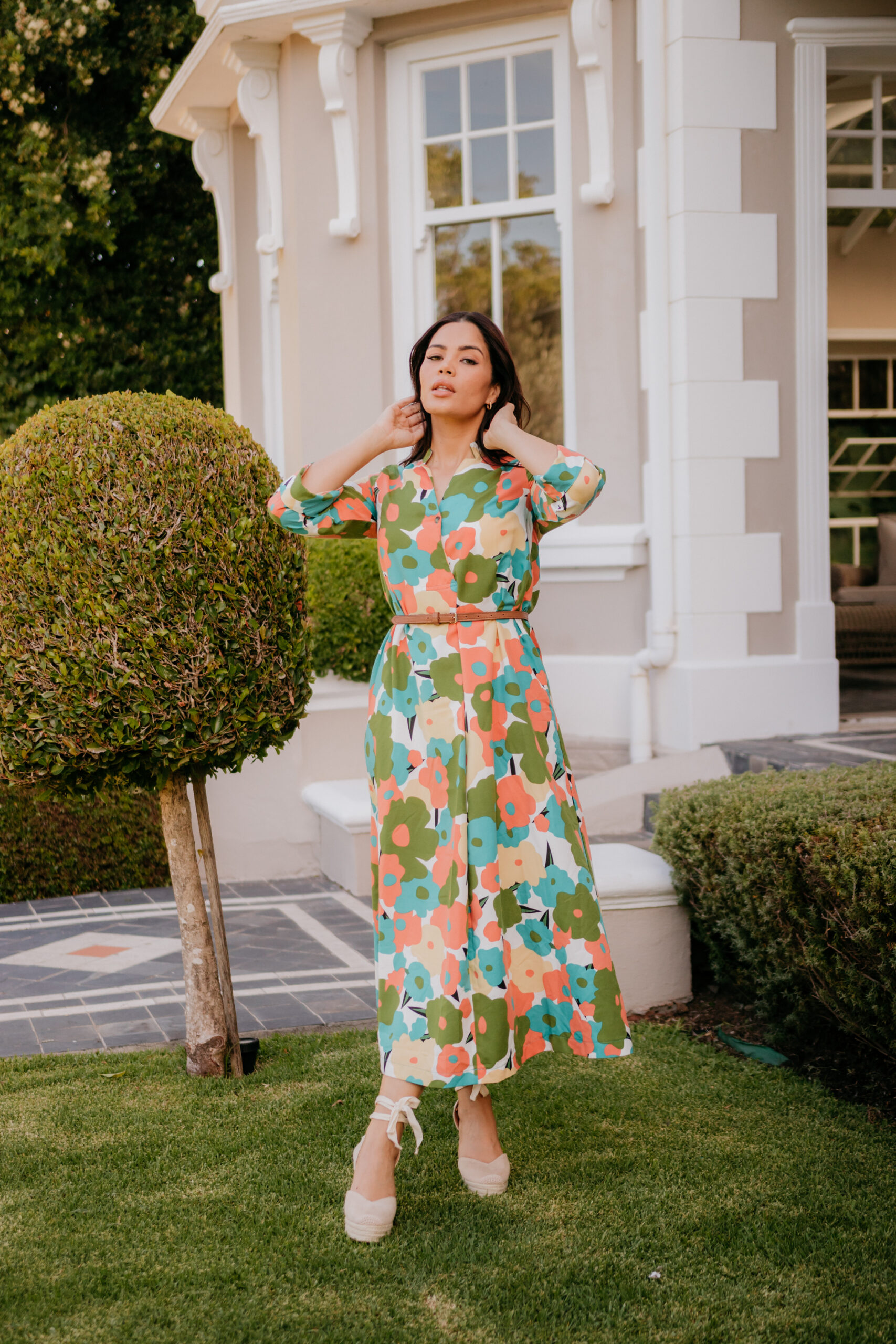 This dress is carefree and playful.Made from Tensile fabric that is perfect for Summer and soft to the touch. Belt not included.